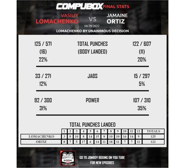 CompuBox’s punch statistics showed that Lomachenko was less effective in his attacking moves and received more from his opponent than in previous fights.