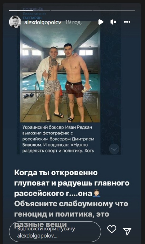 In his statement, Redkach criticized a wave of criticism. The boxer has already been criticized by former Ukrainian tennis player Oleksandr Dolgopolov.
