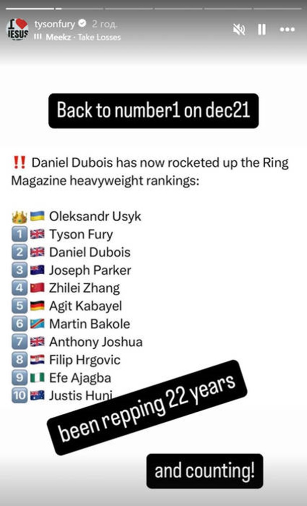 “Back on top December 21st. Still doing it 22 years on,” Fury wrote.