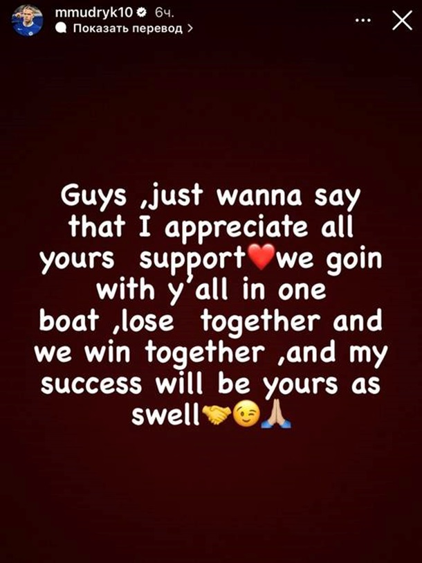 “Guys, I just want to say that I appreciate your support. We are all in the same boat, we lose together and we win together. My success will be your success too,” Mudrik wrote.