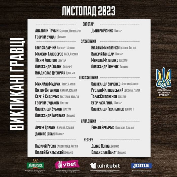 Goalkeepers: Buschan, Trubin, Riznyk.