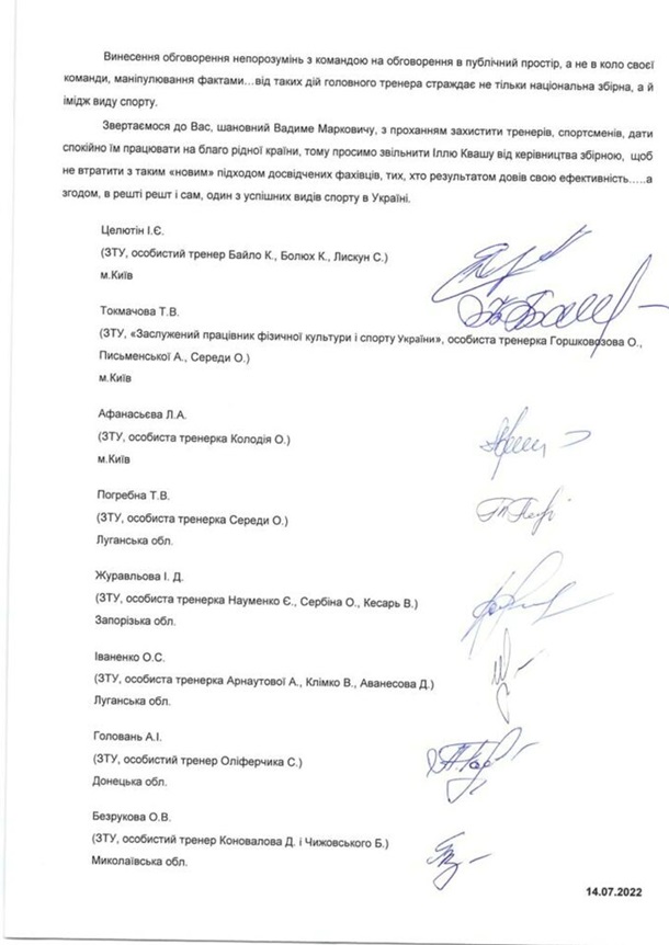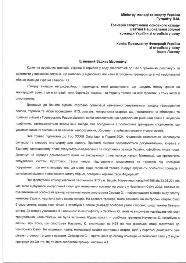 Ukraine’s leading experts in this sport wrote an open letter to Minister Vadim Gutsait. In it, they described the essence of their claims against Kvasha and asked him to be fired.